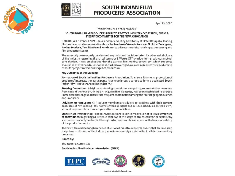 HYDERABAD, 19 April 2026-In a landmark meeting held today at Hotel Dasapalla, leading film producers and representatives from the Producers’ Associations and Guilds of Telangana, Andhra Pradesh, Tamil Nadu and Kerala met to address the critical challenges threatening the film production sector.